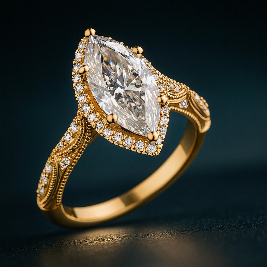14k gold, Marquise Cut Moissanite (12×6 marquise, 1.6ct, D color), prong set center, diamond accent stones