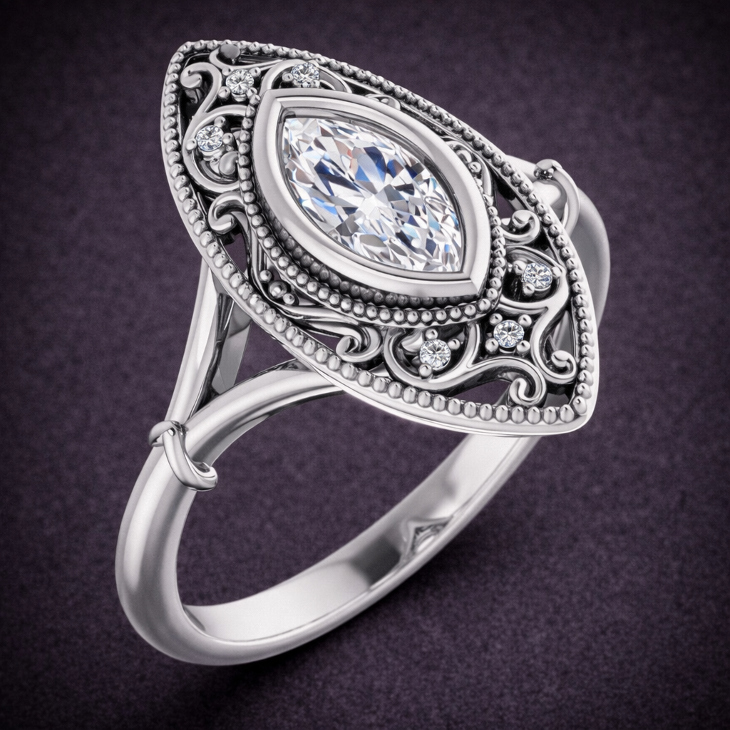 Contiuum Silver, Marquise Moissanite (8x4mm marquise, 0.50ct, D color), bezel set center with accent diamonds